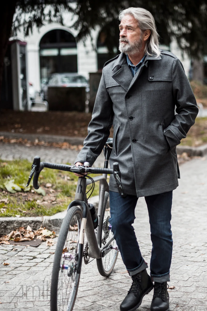 El cuello al hombro, el. charreteras y, por supuesto, los materiales repelentes al agua para los que lo diseñamos: desde Etaproof* para uso durante todo el año o el C-Change* especialmente duradero para los días más fríos. Cualquiera que mire a Franz desde atrás reconocerá diferencias importantes y características típicas de nuestro estilo: pliegues de movimiento en la espalda y dos aberturas laterales para un máximo espacio para los brazos en el sillín de la bicicleta, una correa trasera ajustable con tiras reflectantes. Los puños al final de las mangas también están forrados por dentro con material reflectante. Esto sólo se nota deliberadamente cuando el puño está plegado: simplemente utilidad urbana.