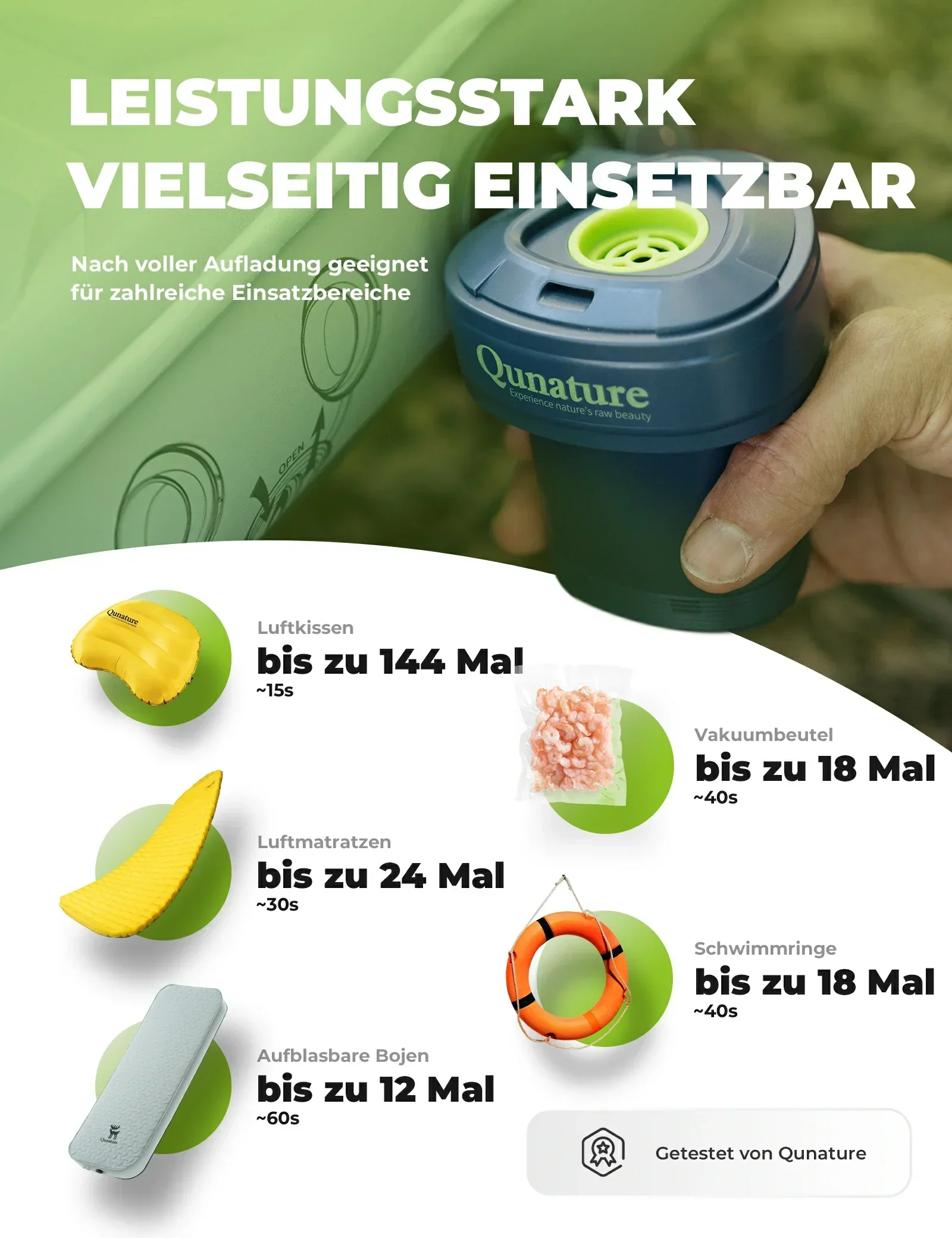 Versátil: Incluye 3 boquillas y un adaptador de válvula universal, apto para colchones inflables, juguetes de piscina, bolsas de aspiradora, colchonetas de exterior y más. Ideal para acampar, hacer senderismo, fiestas en la playa o el jardín.