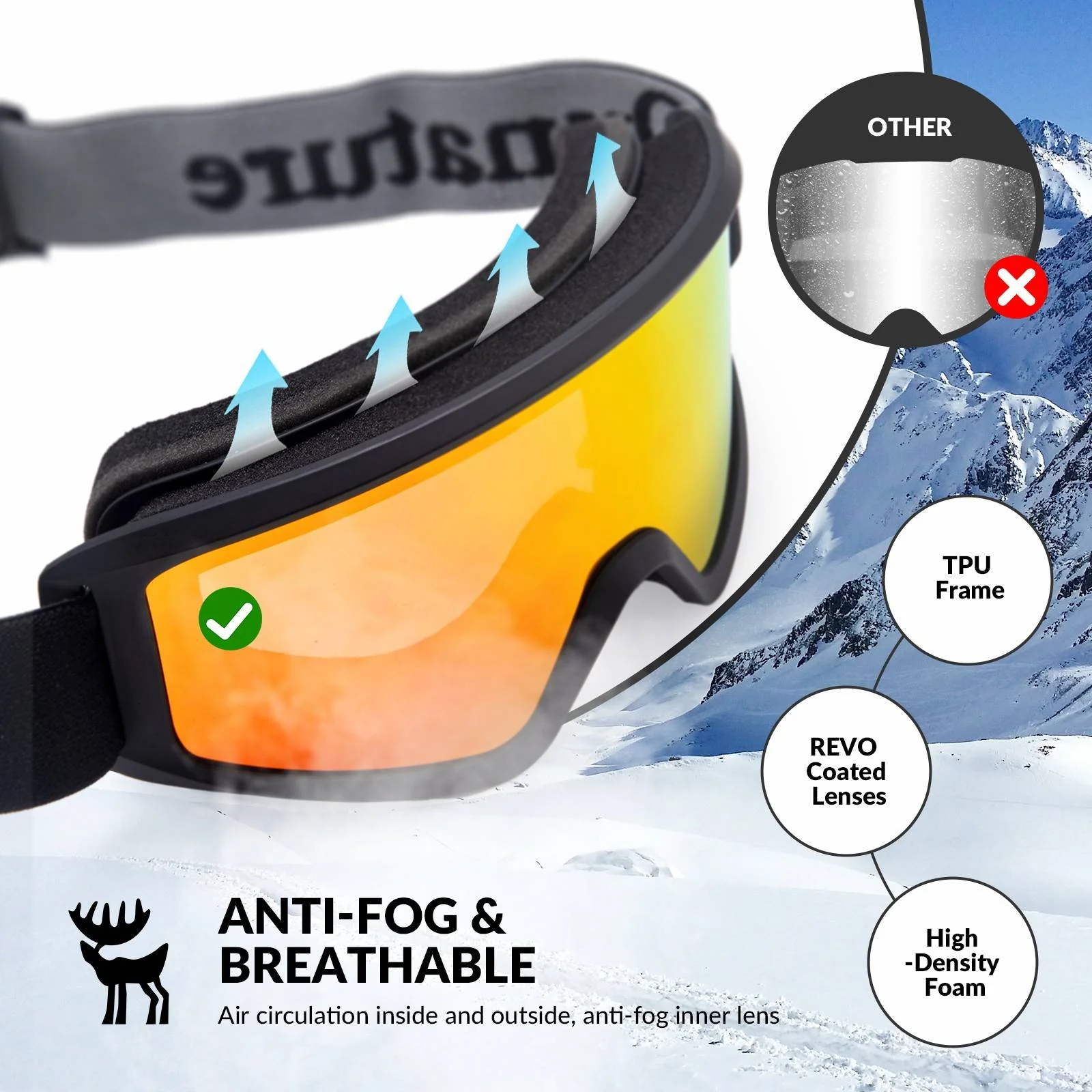 Las lentes interiores están recubiertas con una capa antivaho, lo que garantiza una visión nítida incluso durante largos periodos en la nieve.