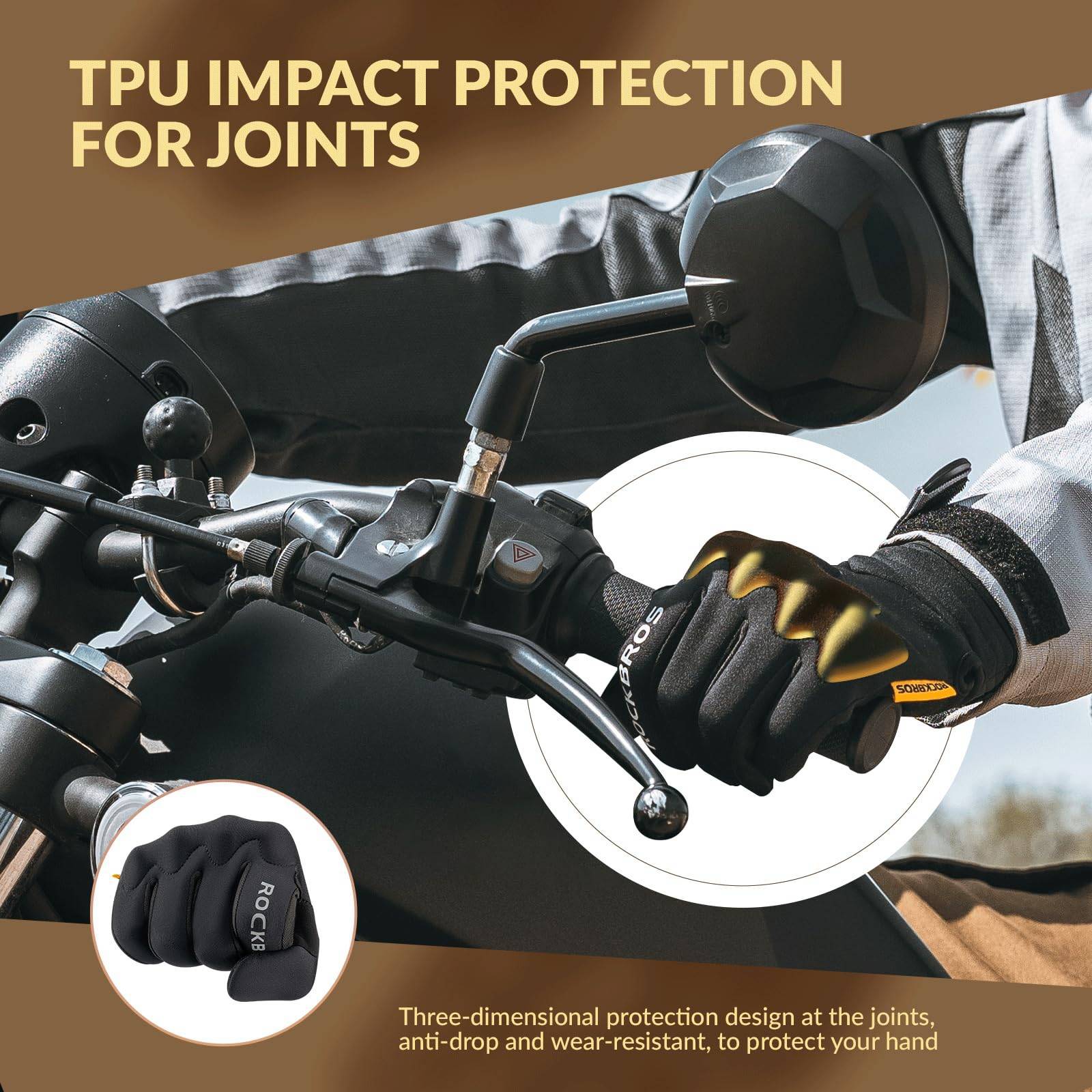 Las tiras de goma antideslizantes en las palmas evitan que las manos se resbalen del manillar y aumentan la seguridad al conducir. La zona de los nudillos de los guantes está reforzada con material de TPU para protegerlos y reducir las lesiones en las manos en caso de accidente.