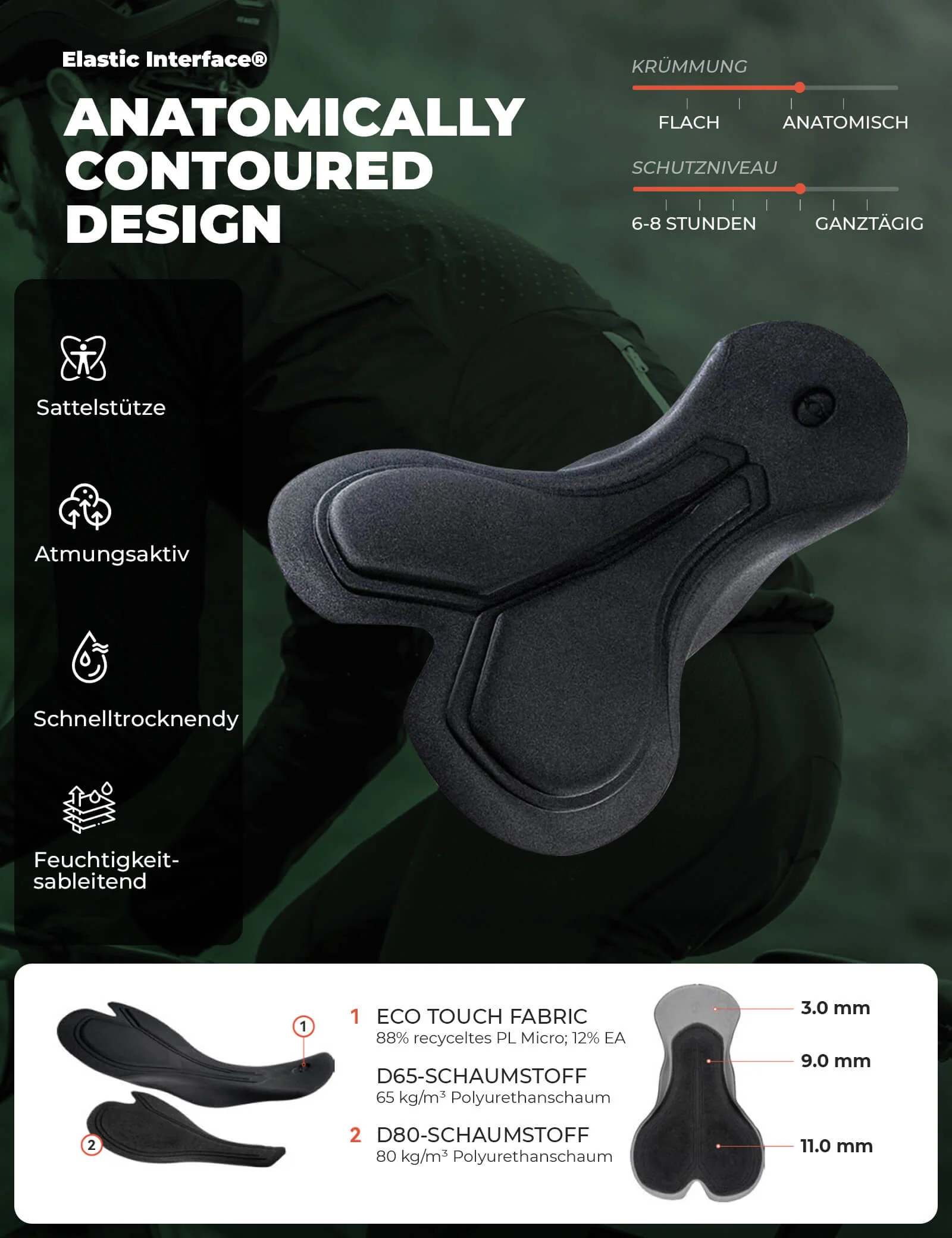 Ajuste de una sola pieza, como una segunda piel, según el estándar Elastic Interface®, minimiza las rozaduras y la irritación de la piel. Contorno anatómico para una estabilidad óptima en recorridos largos.