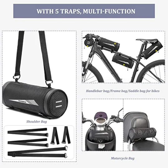 Con 5 correas de nylon desmontables, esta bolsa se puede usar como una bolsa de manillar de bicicleta, bolsa de marco de bicicleta, bolsa de montar de bicicletas, bolsa de hombro, entre otras. Esta bolsa es adecuada para bicicletas, bicicletas eléctricas, bicicletas plegables, bicicletas de carreteras, bicicletas de montaña, manillares de motocicleta, scooters, etc.