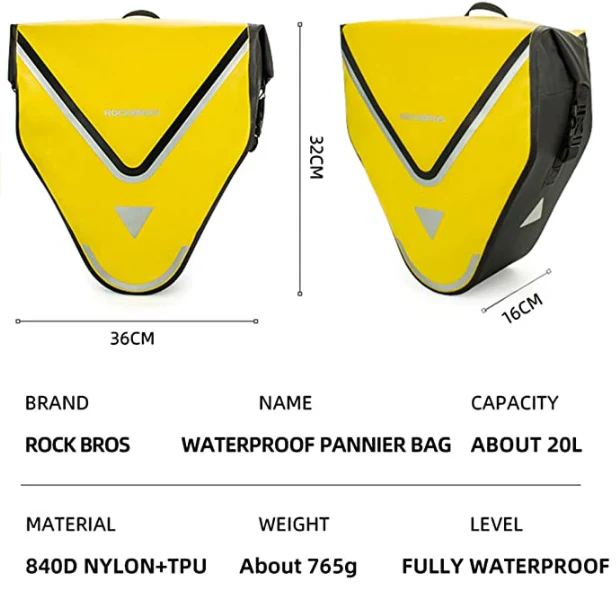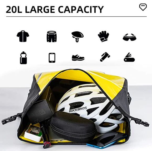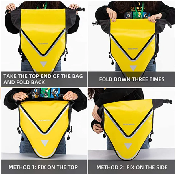 Esta bolsa de bicicleta trasera Rockbros hecha de nylon 840D la cual es totalmente impermeable, duradera y resistente a los rasgados. Con el diseño de rollo, esta bolsa también puede proteger perfectamente los objetos personales en momentos de fuertes lluvias.