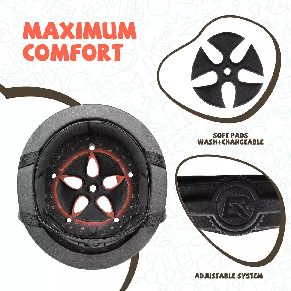 Cómodo y cómodo. Transpirable: La parte superior del casco está diseñada con 11 aberturas de ventilación que garantizan transpirabilidad y comodidad. Este diseño no solo ayuda a eliminar el sudor y mantener la cabeza fresca, sino que también proporciona una ventilación adecuada para que su hijo no se sienta congestionado mientras conduce.