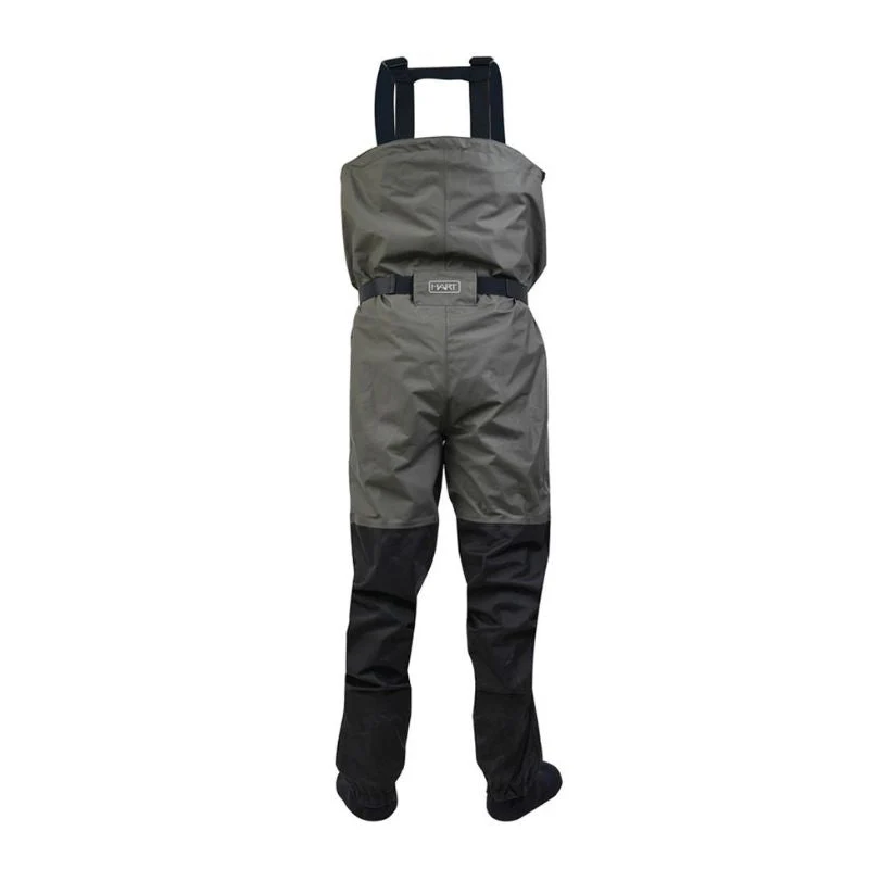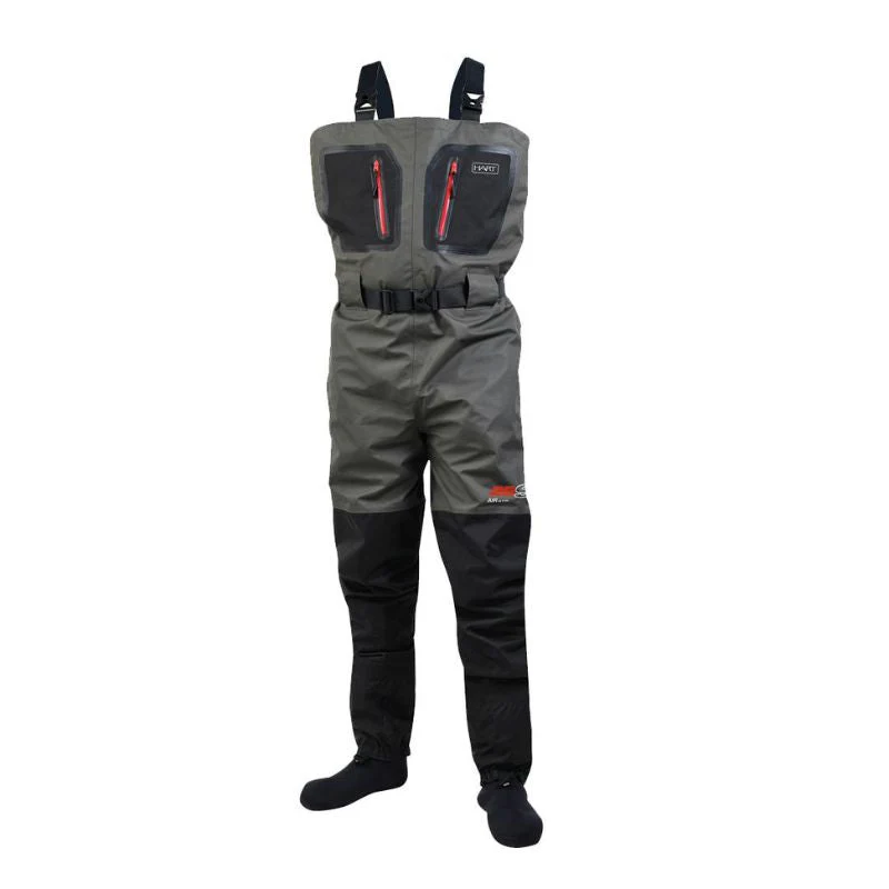 Vadeador Hart 25S AIR STR, vadeador mixto transpirable+reforzado para spinning desde rocas, playas o pato. Piernas con tejido reforzado rip-stop super-técnico y cuerpo en tejido laminado transpirable de 3 capas. Bolsillos en el pecho con cremalleras hidro-repelentes YKK (ATENCIÓN: No es un bolsillo estanco). Tirantes elásticos regulables para un ajuste más cómodo en hombros. Al combinar los enganches macho/hembra del pecho permite plegar el vadeador hasta la cintura y sujetarlo convirtiendo dichos tirantes en cinturón. Cinturón regulable con guía de gruesas trabillas reforzadas. Polainas de tejido rip-stop reforzado con bajo elástico para un calzado más fácil y clip de enganche a bota. Calcetines de neopreno de alta densidad con refuerzo engomado en talón y tendón para evitar el desgaste de la bota.